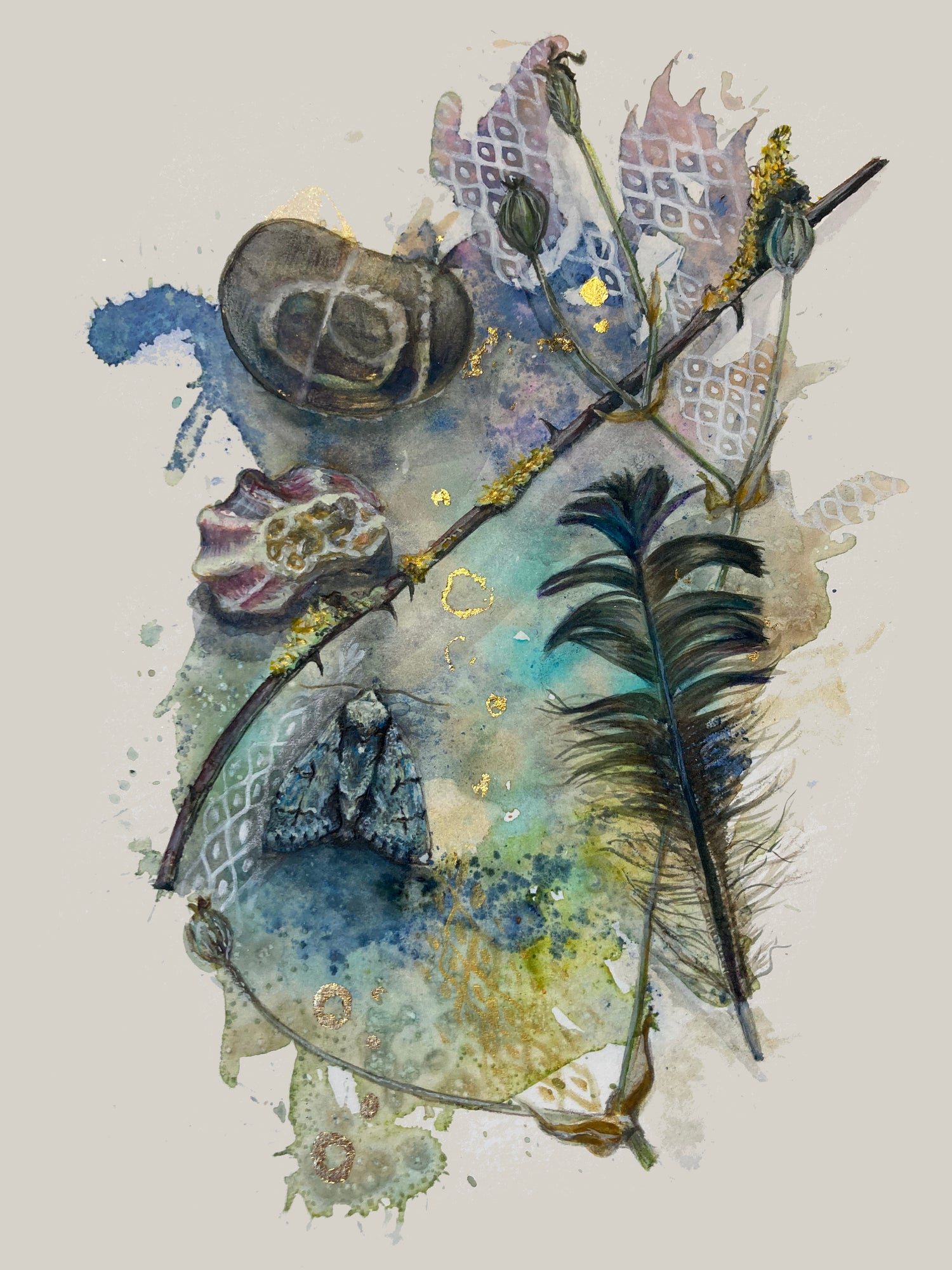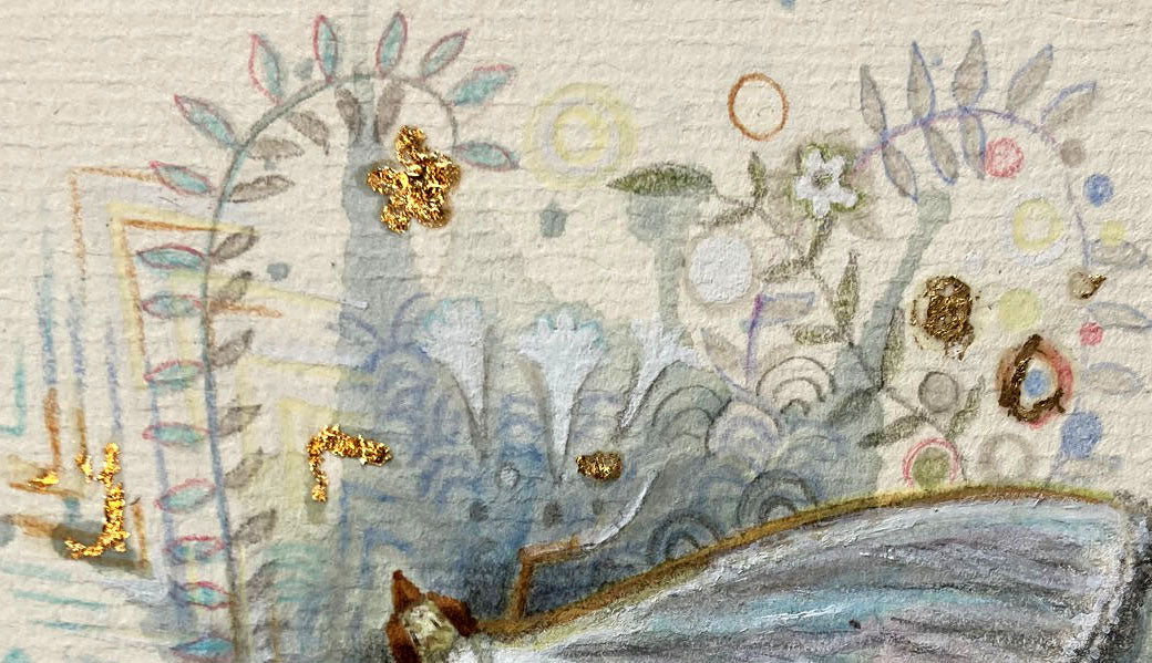 Read moreWho are we without our memories? My Father was diagnosed with dementia some time before I began this Spell. During the slow process of its creation he moved into a care home and passed away. Coming back to work on this painting during those months was a helpful way to process what was going on and gave me space to wonder about memory. Who are we when the memories fade? What really matters in the end?